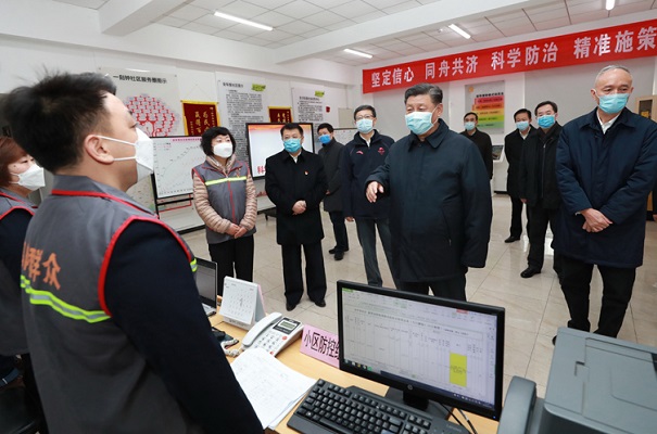 2月10日,中共中央总书记、国家主席、中央军委主席习近平在北京调研指导新冠肺炎疫情防控工作。这是习近平在朝阳区安贞街道安华里社区,了解基层一线疫情联防联控情况。