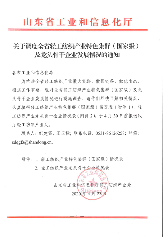 附件:1、关于调度全省轻工纺织产业特色集群(国家级)及龙头骨干企业发展情况的通知.pdf
