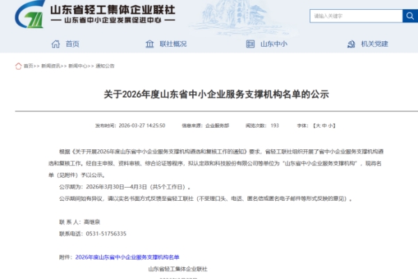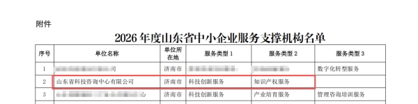 近日,山东省轻工集体企业联社公布“2026年度山东省中小企业服务支撑机构”认定名单。公司凭借在科技创新服务、知识产权服务、数字化转型等领域的扎实专业能力与突出服务成效,顺利通过复核评审,再次入选并纳入省级中小企业服务支撑机构库。